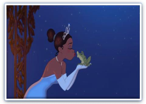 Sin embargo, todo eso se vio frustrado cuando una noche por error besa a un sapo, pues en una leyenda que se conoció como “El Príncipe Sapo” los sapos se convertían en príncipes solo con el roce de un beso, pero a Tiana le paso lo contrario ella se convirtió en Rana.
